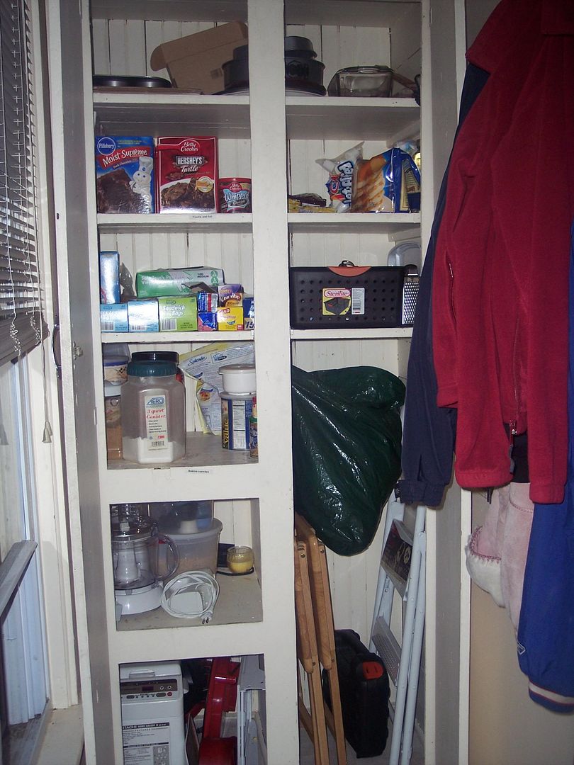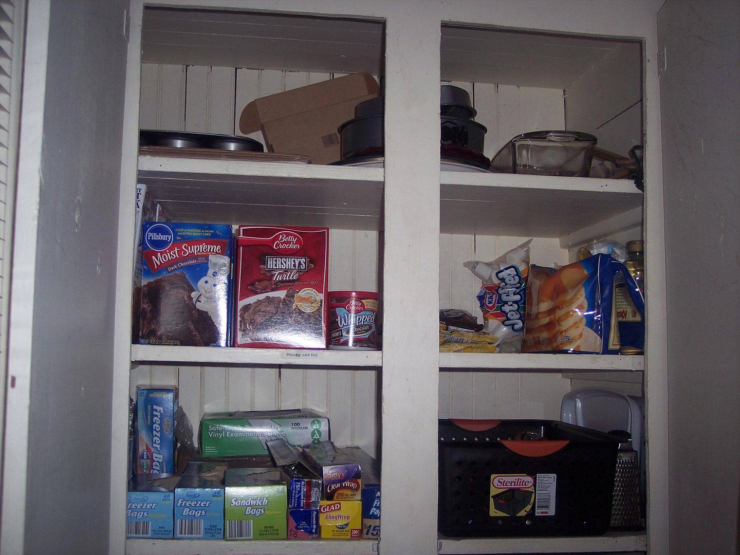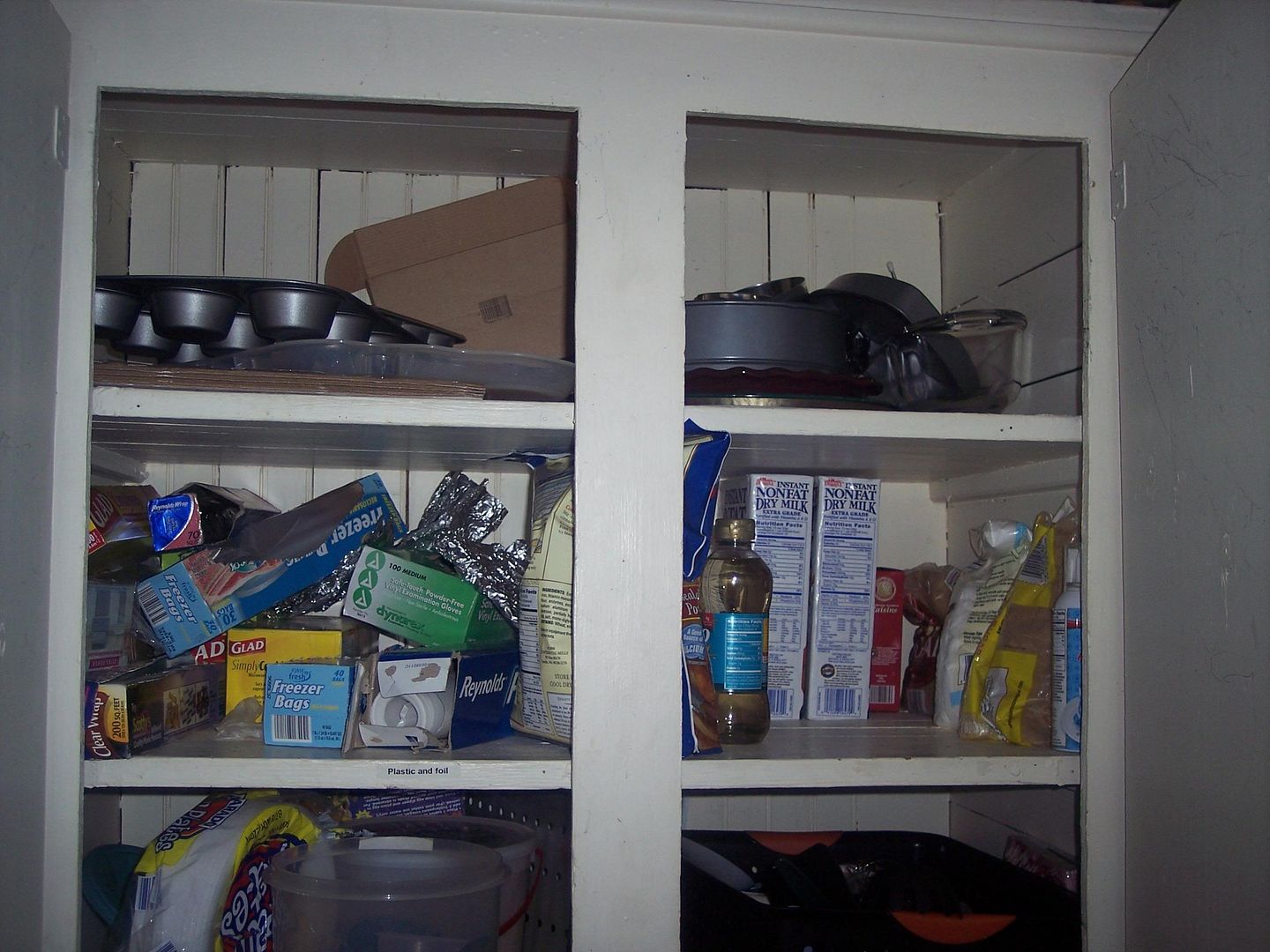 Isn't it just awful, really? This is what happens when your family just throws things in the cabinet instead of putting things back where they belong! So, I took to the task of organizing and cleaning this baby out. I put all the extra boxes of mac n cheese in my other cupboard and put all the brownie and cake mixes in this cabinet. This only makes sense because my baking supplies are in this cupboard. I took a few things out that I decided need to either go in the basement or be put in a rummage sale. This let me move all the plastic wrap, aluminum foil, etc down a shelf (I plan on buying something to hang them in when I have money) and have a whole shelf for my baking stuff. So, here is what the cupboard looks like now: